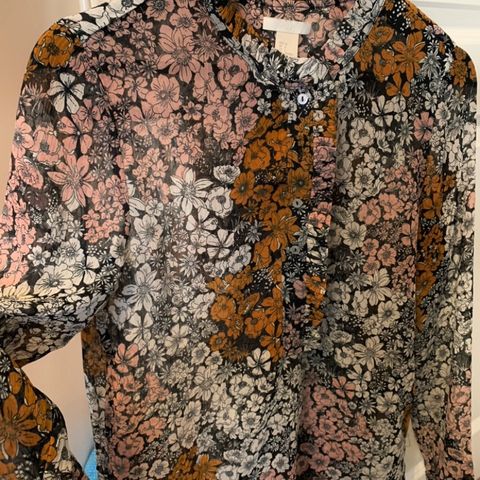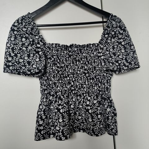 Tummansinisellä pohjalla pikkukukkia. Selkäosa yksivärinen. Vajaamittaiset hihat. Viskoosia, hieman elastiinia. Koko 36. Takaa pidempi.