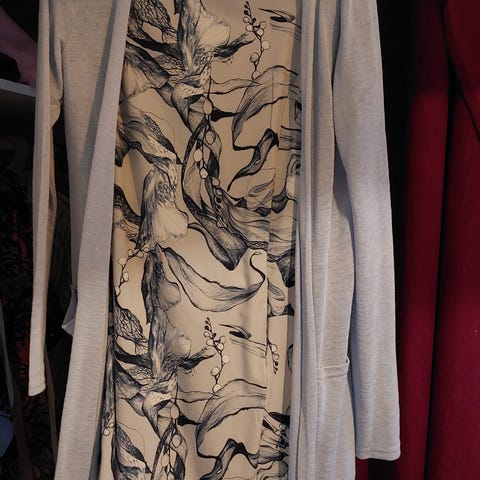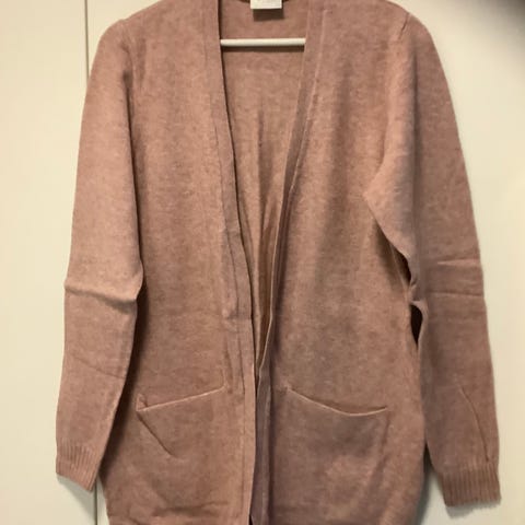 Todella paksu pitkä neuletakki, jossa taskut. Hihoja lyhennetty siististi harsimalla. Saa helposti purettua auki. Menee keväällä/syksyllä ulkotakista, on niin paksu takki.