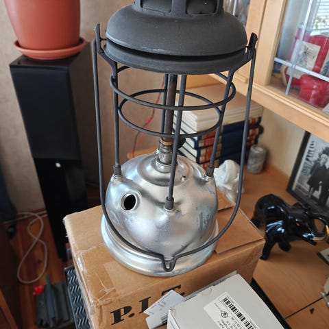 Tuulastukseen tai muuhun tarpeeseen erittäin tehokas antiikkinen valaisin.