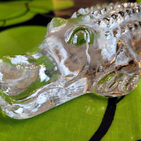 Matilda-Krokotiili, muuten hyvässä kunnossa mutta hännästä lohjennut pala, kuvasta näkee.