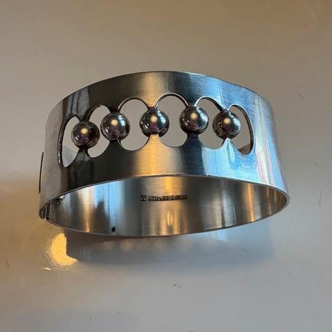 Tapio Vanhatalon suunnittelema vintage-rannekoru. Leveys 2,5 cm, pituus 19,5 cm.
