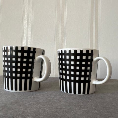 Mustavalkoiset Arabian Teema-mukit. Mustavalkoinen Ruutu kivasti yhdistettävissä monenlaiseen kattaukseen.