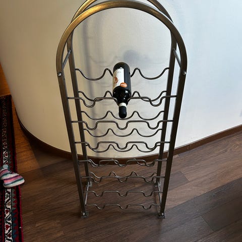Metallinen viinipullon teline.Korkeus 148cm ja leveys noin 45cm.