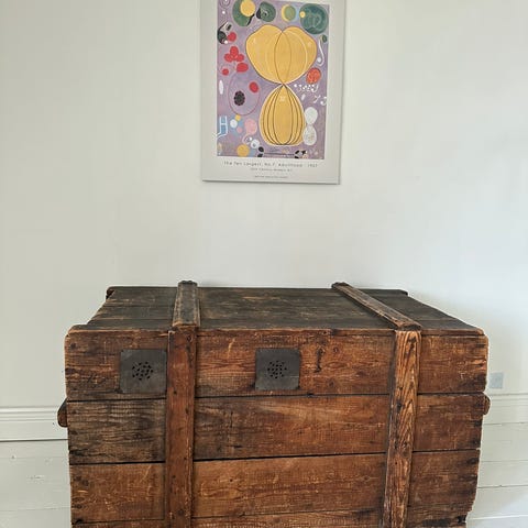 Hankittu huutokaupasta aikaan 250€ hintaan muiden antiikkikalusteiden kanssa mutta nyt se ei enää mahdu meille. Tästä en vuosilukua ole löytänyt mutta toisessa samassa erässä olevassa luki 1769 eli todella vanha on varmasti tämäkin.