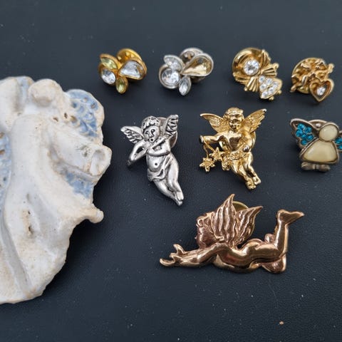 Muitakin enkeliaiheisia pinssejä myynnissä.