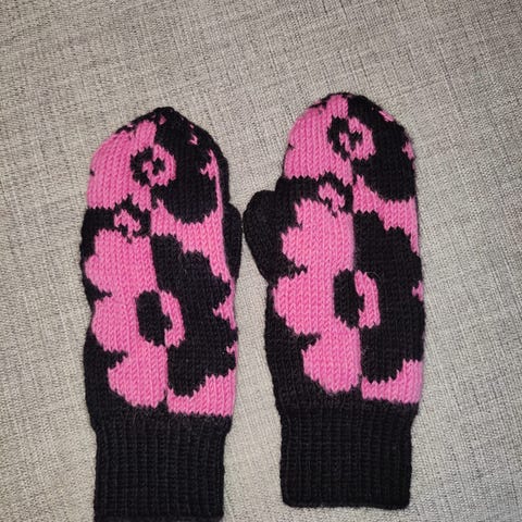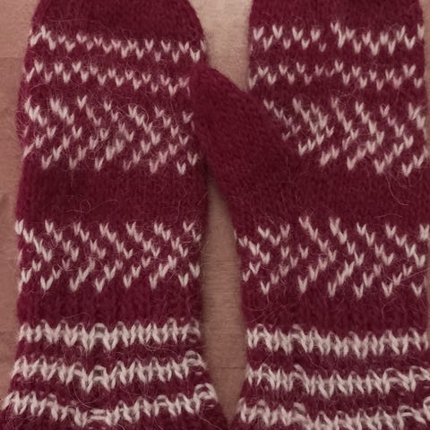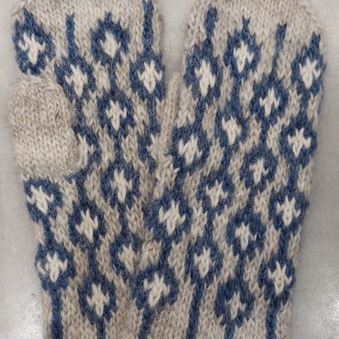 lapasia islantilaisesta Lettlopi villalangasta. Kuvan 1. siniset lapaset, koko pituus on n. 25 cm. Kuva 3. Valko-beiget, koko pituus 26 cm. Kuva 5. Valk pääväri, koko pituus 28 cm. Hinta 30/pari.