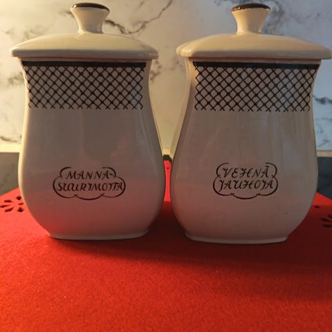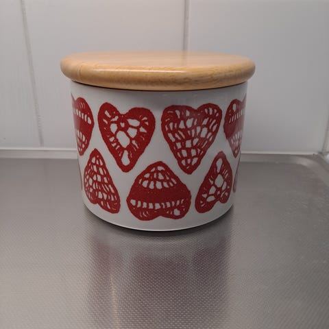 Myydään Arabian vanha keraaminen säilytyspurkki alkuperäisellä kannella ja tiivisteellä. Hyväkuntoinen ja ehjä, pientä krakelointia/halkeamia näkyy lasitteessa, ei tunnu, eikä vaikuta käyttöön.