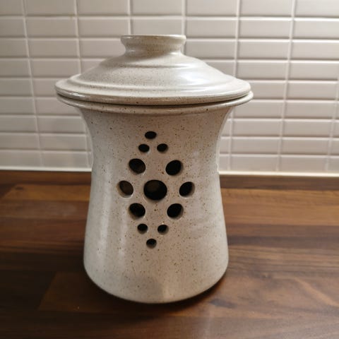 Valkoinen säilytysastia sipuleiden säilytykseen. Sipulipurkki on halkaisijaltaan 14,5 cm ja korkeudeltaan 21 cm.