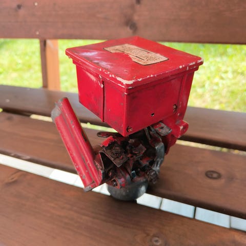 Osaavalle rassaajalle 1960-luvulta peräisin oleva patteritoiminen polttoainepumppulelu. Takalevy puuttuu ja lelu ei muutenkaan ole toimintakuntoinen. Mutta taitavissa käsissä tämäkin hieno lelu on herätettävissä henkiin.