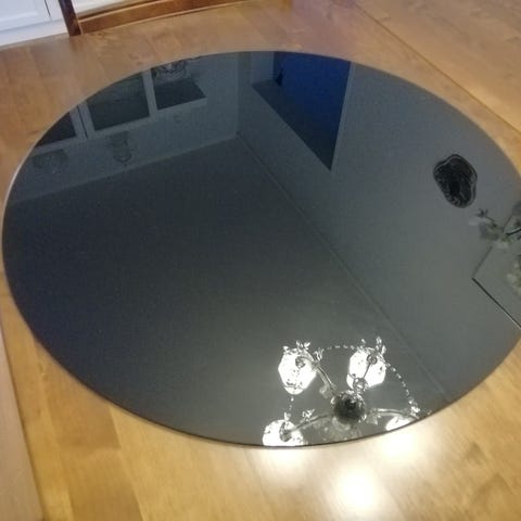 Pöydän fasettihiottu 100 cm halkaisija oleva lasilevy.
