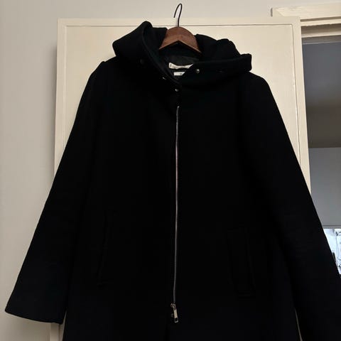Siisti, harmaakoristeinen takki (villa 80%, 20 % polyester), kiinnitys napeilla ja vyöllä, sivutaskut, läpivuoritettu. Pituus olalta helmaan 98 cm.