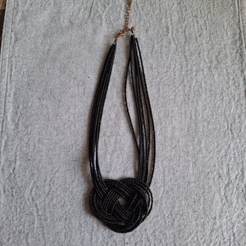Musta kaulakoru jossa mustia helmiä. Lyhyt, voi varmaan ketjulla jatkaa lukko-osaa.