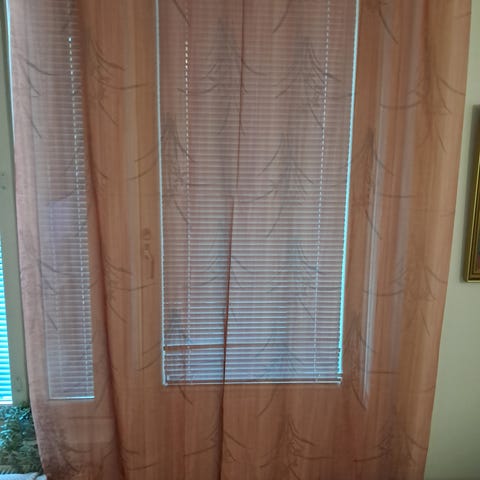 Kaunis kimaltava verho. Puun kuviot koko verhossa. NOUTO TIKKURILA.