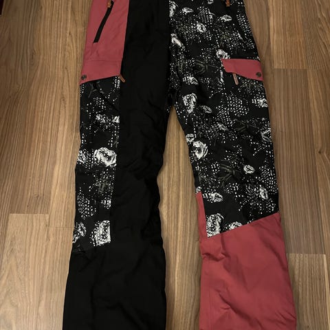 Pirteän vaaleanpunaiset Icepeak toppahousut koossa 38. Kerrankin toppahousut jossa on heijastimia. Recco- paikannus, irroitettavat olkaimet, vyötärön säätö tarralla, lahkeen säätö vetoketjulla ja tarralla, lumilukot, tuuletusaukot. Ainoa vika on toisen vyötärö napin/hakasen puuttuminen, ei ole haitannut käytössä. Haaleaa likaa lahkeensuissa ja taskuissa joka luultavasti lähtee pesussa.