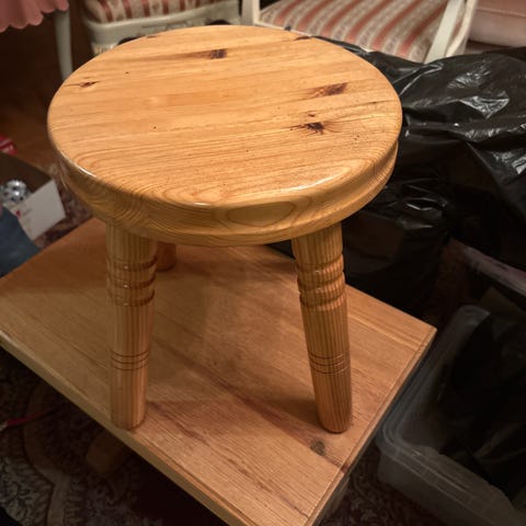 Nikkarin tekemä käyräjalkainen tukeva jakkara myynnissä. Materiaali on koivua ja pintakäsittelynä vahva lakka. Istuimen mitat 32x32 cm ja jakkaran korkeus 32 cm. Todella tukeva istuin käyttöön.