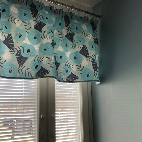 Finlayson vihreä verhokappa. Korkeus on 52 cm ja leveys on 240 cm.