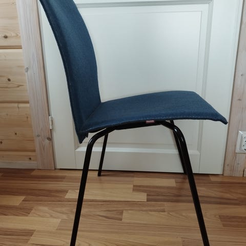 Ruokailuryhmän tuoli 4 kpl. Malli on Martelan PAN 331A, verhoiluna tumman harmaa huopa. Korkeus 82 cm, leveys 53 cm, syvyys 53 cm. Istuinkorkeus 45 cm. Metallijalat harmaat. Tuoli on suunniteltu toimistokäyttöön, mutta menee hyvin ruokailuryhmän tuolina. Voi ostaa yksittäinkin, hinta silloin 15 euroa/kpl.