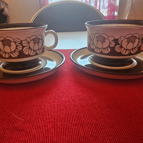 Katrilli kahvikuppi, tassi ja pullalautanen 12 kpl, yhdessä kahvikupissa pieni lovi, kuva tästä. Hyvässä kunnossa 35 euroa/ yksi setti. Mieluiten myyn kaikki kerralla. Tarjoa
