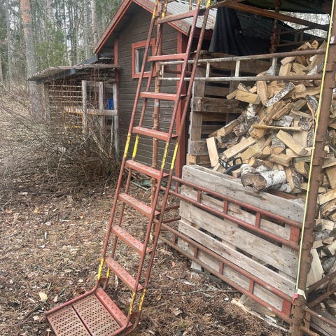 (6m korkea = 8 pystytolppaa á 3m, 8 x 3m vaakajokka, 8x 1.6 m lyhyt jokka, 11 x metallivahvisteista puuritilätasoa)