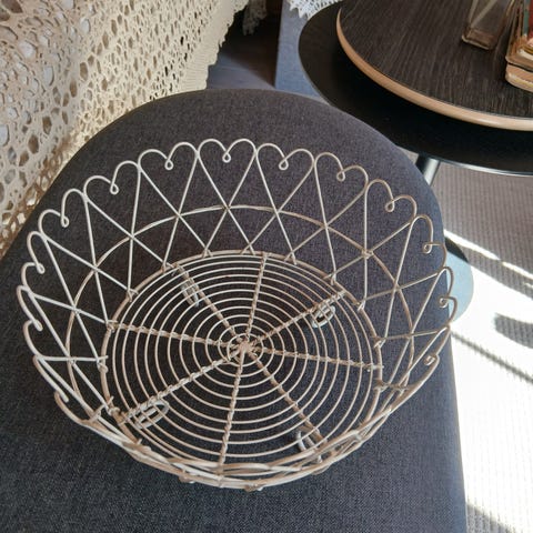 Vanha ja patinoitunut metallinen kori. Sydämenmuotoinen. Esim. Hedelmille. Halkaisija noin 24cm.
