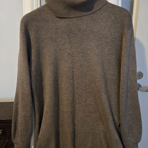 Vain muutaman kerran käytetty. Korkea poolokaulus ja lyhyt malli, kuvassa näkyy mitattu pituus. Molemmissa kainaloissa ja kahdessa muussa kohtaa pieni langanpurkauma (katso kuvat).