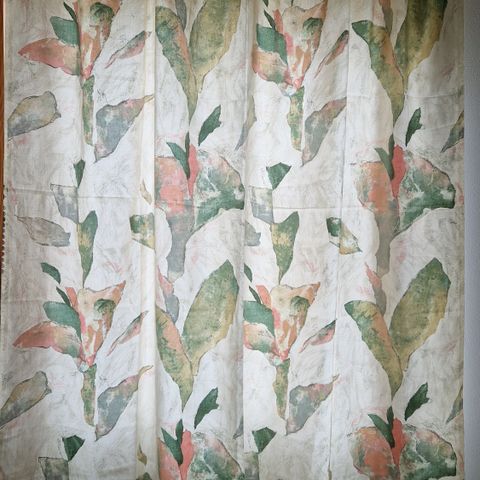 1 kpl, pituus 142 cm, korkeus 43 cm, tässä verhossa lintukuvio toistuu kolme kertaa, hinta 20 €