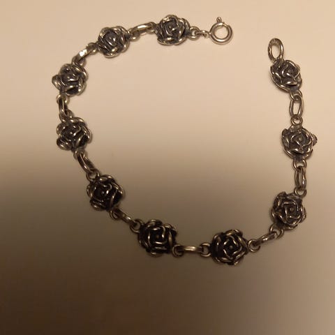 Myydään kaunis ruusu rannekoru, hopea, vintage. Leimat: 830H hopea, kruunu kotimainen tarkastusleima, T7 vuodelta 1972. Rannekorun pituus 18 cm, leveys 8 mm, varmuuslukko. Koru on hyväkuntoinen.
