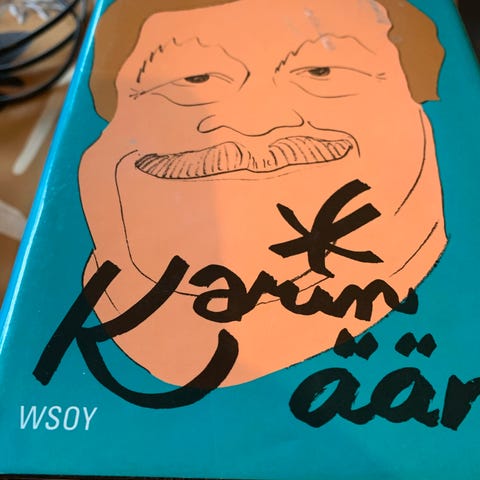 Kuvan Kari Suomaisen pilapiirros kirjaa.