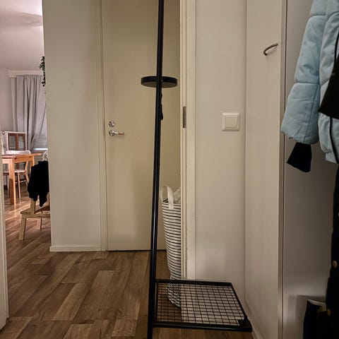 harmaa metallinen naulakko, jossa on lipasto (2 laatikkoa), kenkäosasto ja peili.