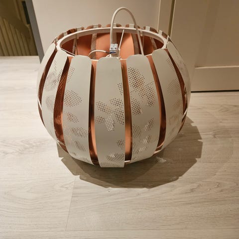 Kaunis kattovalaisin. ’Kruunun’ korkeus 27 cm, riiputtimen 42 cm. Eli yht. n. 69 cm. Lasimainen, taitaa kuitenkin olla muovia ja metallikehykset.
