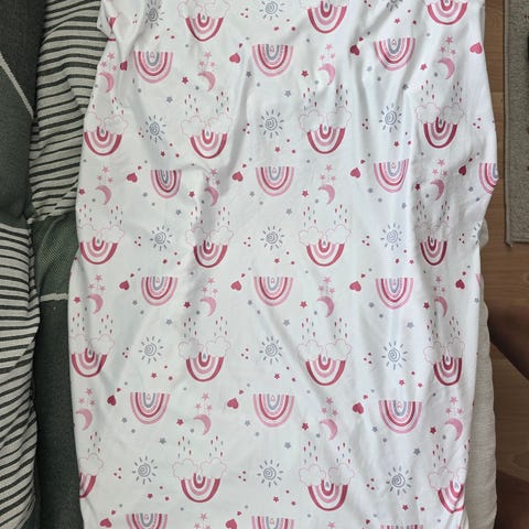 Käytetty vain vähän aikaa ensisängyssä, jonka jälkeen ollut vain talosängyn katoksen sisäpuolisena kankaana, että lapsi voi rauhoittua sängyssään tutkien pitkältään käsin yläpuolellaan näkyviä kankaan kuvia. Ei ole ollut siis varsinaisessa lakanatarkoituksessa kovinkaan kauaa, joten kunto on erinomainen.