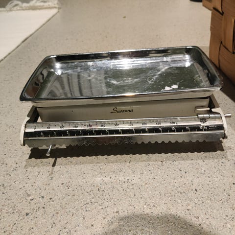 Pituus 42 cm, syvyys 16,5 cm ja korkeus 22 cm. Messinkisessä, päällä olevassa osassa on vuosiluku 1961. Minä en tiedä, että mitenkä tällä punnitaan muuta kuin sen, että toiselle puolelle laitetaan painoja....Jäi äidiltäni, jolla tämä oli sisustusesineenä keittiössä.