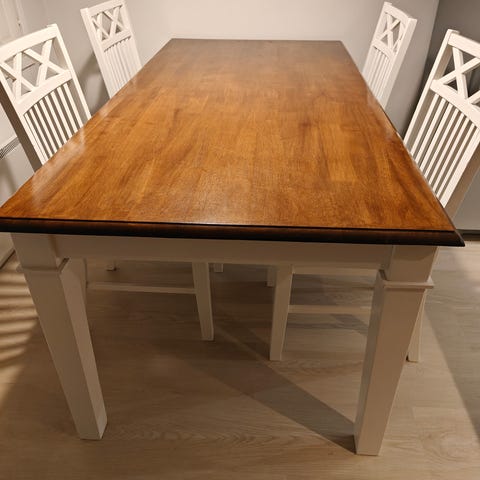 Mahonkivärinen puinen ruokapöytä ja kahdeksan puista tuolia, joissa vaaleat istuinosat. Kalusto soveltuu ruokailutilaan tai vastaavaan käyttötarkoitukseen.