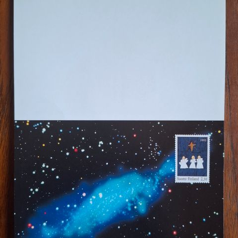 Postimerkkikeskuksen joulutervehdyskortti vuodelta 1994 joulumerkeillä ja joulun erikoisleimalla.