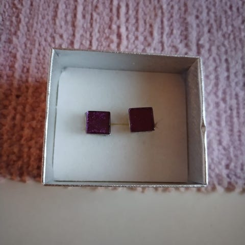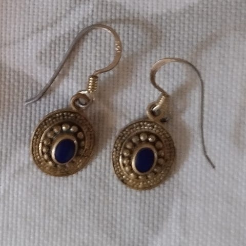 Valkoinen keraaminen, sininen lasia ja punainen kangasta. 90-luvulta.
