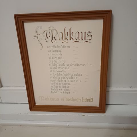 P. Franciskus Assialaisen rukous taulu. Vapahtajani,tee minusta rauhasi välikappale;niin että sinne missä on vihaa,toisin rakkauden,missä on loukkausta,toisin anteeksiannon,missä epäsopua,loisin yksimielisyyden,missä erehdystä,osoittaisin totuuden,missä epäilystä,auttaisin uskoon,missä epätoivoa,nostaisin luottamuksen,missä pimeyttä,loisin Sinun valoasi,missä surua,virittäisin ilon ja lohdutuksen. Niin että,oi Mestari,en yrittäisi niin paljon etsiä lohdutusta kuin lohduttaa muita,hakea ymmärrystä kuin ymmärtää toisia,pyytää rakkautta kuin rakastaa muita. Sillä antaesaan saa,kadottaessaan löytää (MATT 10:39),unohtaessaa saa anteeksi,kuollessaan nousee iankaikkiseen elämään. Taulun koko: Pituus 32,7cm x leveys 26,8cm. Lasi päällä. Haku tai postitus.