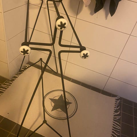 Kaunis ja tukeva metallinen koukkuteline, jossa Fleur-de-lis -yksityiskohta. Ostettu Porvoon vanhastakaupungista sisustusliikkeestä. Väri valkoinen, hieman kulunut viimeistely (shabby chic -tyyli). Kolme koukkua esimerkiksi takeille, avaimille tai keittiöpyyhkeille.