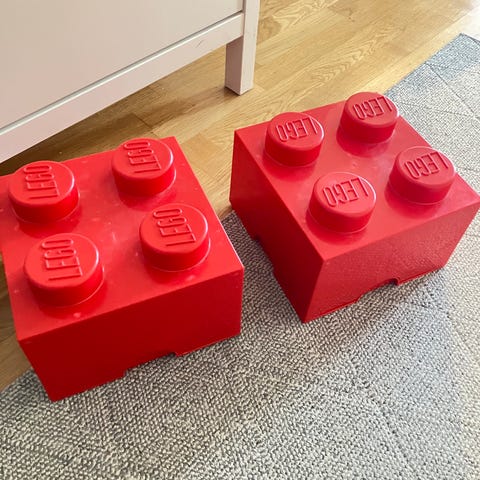 Kaksi yhteensopivaa Lego säilytysrasiaa. Molemmat avautuvat