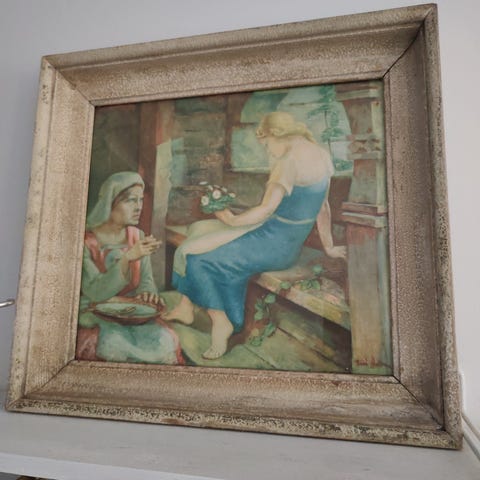 Erittäin vanha, tummanpuhuva taulu. Puukehykset, koko 57,5x46cm. Lasissa vain heijastumia valosta kuvausvaiheessa. Ei mikään kedon kaunein kukkanen, mutta jollain lailla ns. siisti. Sopii hyvin talonpoikais sisustukseen. Nouto.