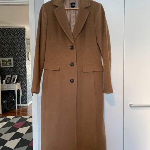 Takki on 48 % villaa ja 36 % mohairia + loppu tekokuituja. Koko kai-kai 52 cm ja kai-helma 59 cm. Kuvassa takki näyttää väriltään epätasaiselta, mutta on tasaisen tumman harmaa. Takki on A-linjainen.