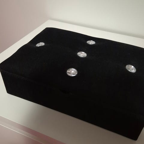 Ruskea korurasia vinyyliä. Kork. 4 cm, levein kohta 12 cm. Kannessa sisällä peili.
