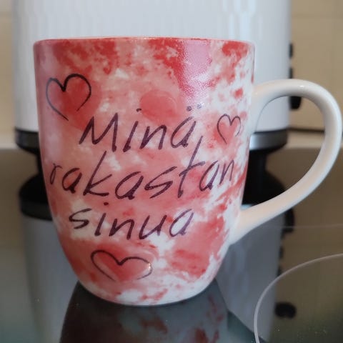 Kauniisti kirjailtu äidin kahvikuppi lautasella.Jäänyt kaappiin käyttämättömäksi.On sisältä myös täysin siisti,kuvaan halutessa.Vetoisuus 3dl (täytenä)