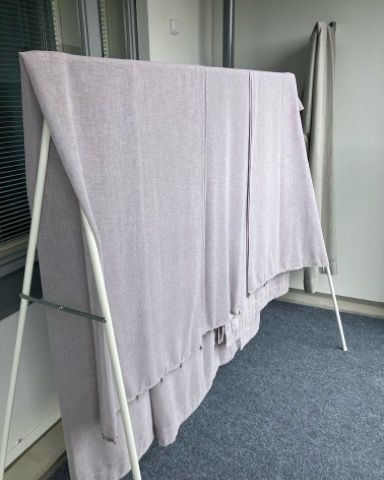 Laadukkaat sivuverhot hieman läpikuultavaa harmaata/tummanharmaata kangasta. Tankokuja. Savuton koti. Kääpiöhamsteri asuu häkissä.