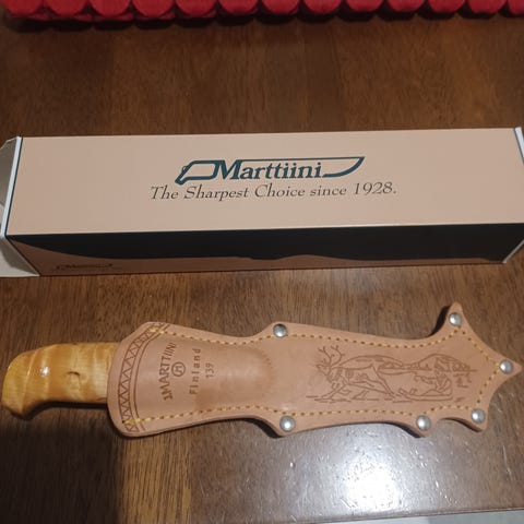 Suomessa valmistettu Rovaniemeläisen J. Marttiinin komea koivukahvainen puukko sekä poronnahkainen tuppi. Kahvan lakka ottanut auringosta sävyä ja tupessa sääpatinaa. Kaikin puolin ehjä. Terä ruostumatonta terästä.