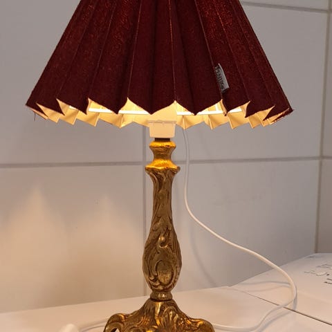 Jykevä, korkea pöytävalaisin, vanhan messingin värinen. Sähköistys kunnossa. Varjostin Pentikin, tulee kaupan mukana. Kaunis vaikkapa isompaan aulaan tai olohuoneeseen.