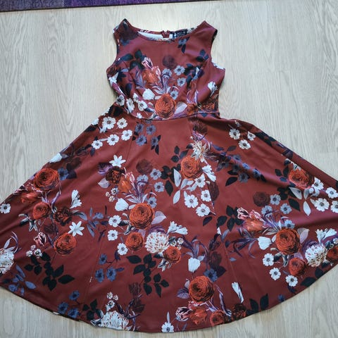 Käyttämätön Lady V London: Lyra red gingham dress, kokomerkintä UK 12. Punainen väri on oranssiin vivahtava. Lyhyet hihat, levenevä helma.