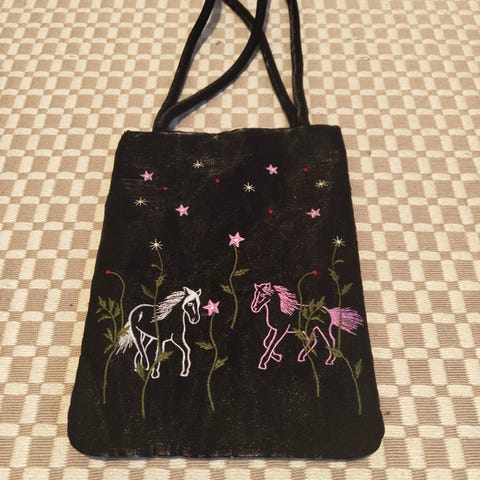 Pehmeä hieno olkalaukku hevosten kuvilla.