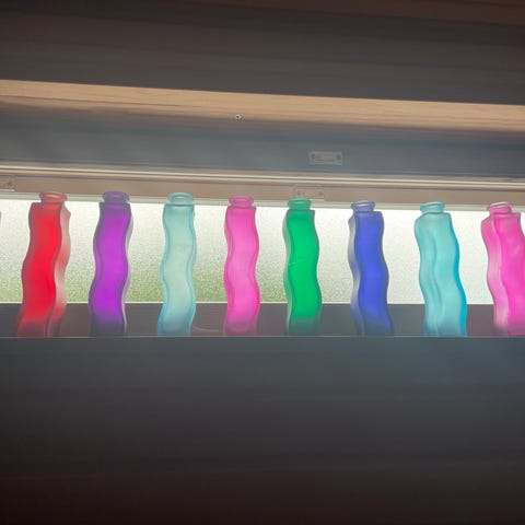 Valkoiset nylonharjakset puhdistavat eri kokoiset pullot.