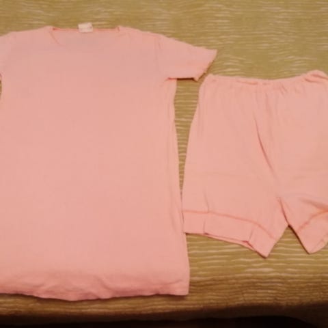 Vintage vaaleanpunainen/lohenpunaiseksi liian haaleat.Ihanan pehmoista puuvillaa, koko numero paidassa ja housuissa 48 - ei tietoa vastaako laisinkaan nykykokoa. Myydään asuparina.Pesty 60 C.