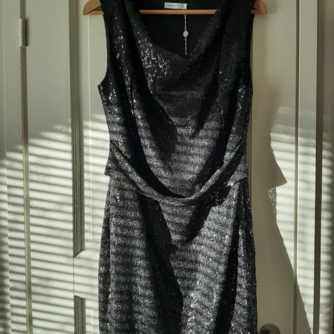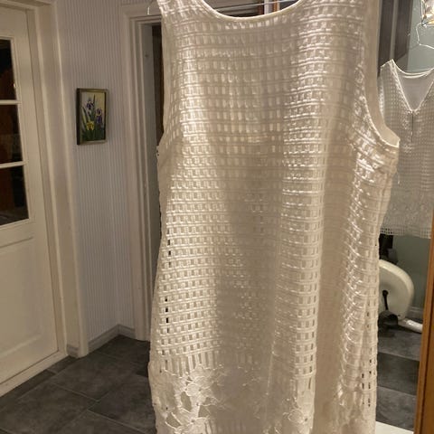 Selectin edestä musta/puna/valkoinen ja takaa kokonaan musta mekko. Materiaali 97%polyesteria ja 3% elastaania, vuori polyesteria. Konepesu 30 asteessa. Ei juurikaan kaipaa silitystä. Mitat, kainalo-kainalo 60cm, pituus 102cm.